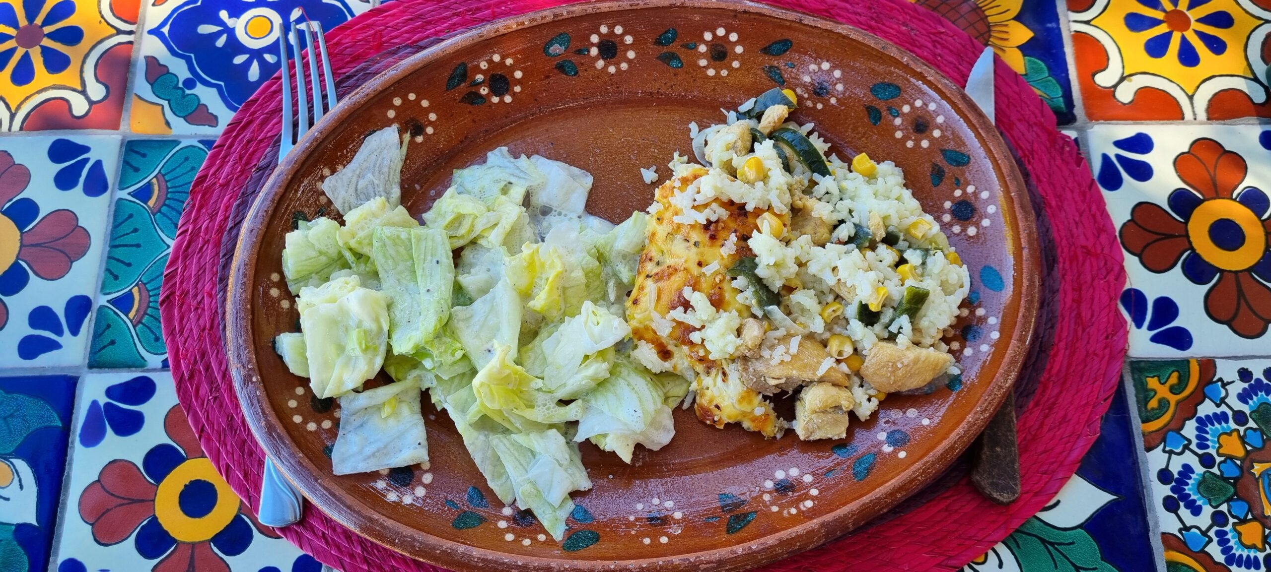 Place the rice in the bottom of a casserole. In a frying pan, fry the onion, corn and the chile. When cooked add the cream to the mixture and the chicken stock. Then, pour the mixture over the rice and then add the chicken on top. Next sprinkle the cheese on top and season with the salt, pepper and oregano. Finally pour the milk over the whole dish, thereby ensuring all the flavours mix. Place the casserole in a pre-heated oven at a temperature of 240°C (475 °F) for 20 minutes or until golden.
