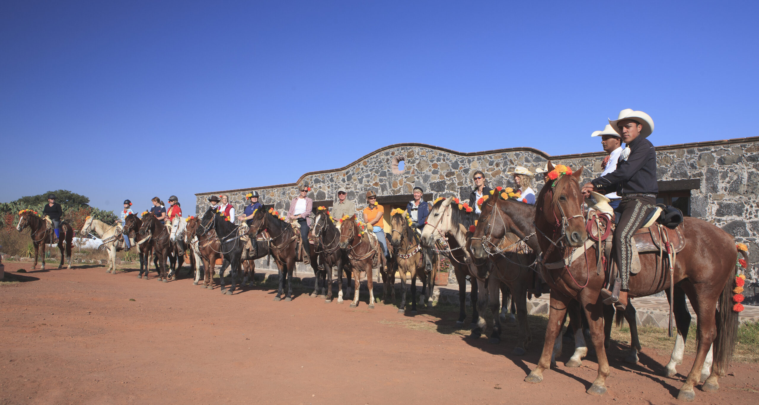 Nowhere in this corner of the country, are the festivities more enthusiastic than in the colorful towns of Canalejas, Tepotzotlán and Jilotepec, all in the vicinity of the ranch. In front of the cathedrals and in the cemeteries is a festive, three-day occasion with masses of orange Marigold flowers. There are skeletons at every turn, life-size ones made of terracotta, grinning bony grins from under large sombreros, playing guitars and drums, doing all the fun things they did as living beings.